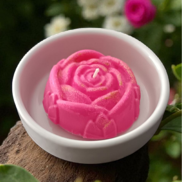 Laissez-vous envoûter par cette bougie artisanale en forme de rose, moulée et coulée à la main.